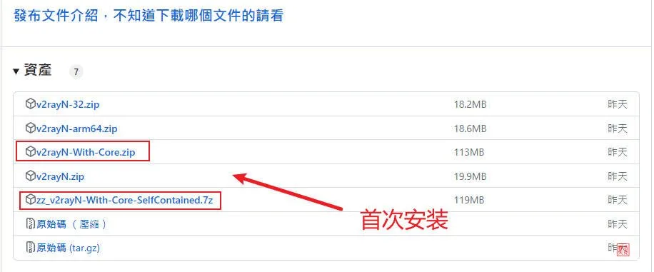 选择相对应的架构版本下载安装,第一次请下载 v2rayN-With-Core.zip 或 zz-v2rayN-With-Core-SelfContained.7z,包含所有Core文件。